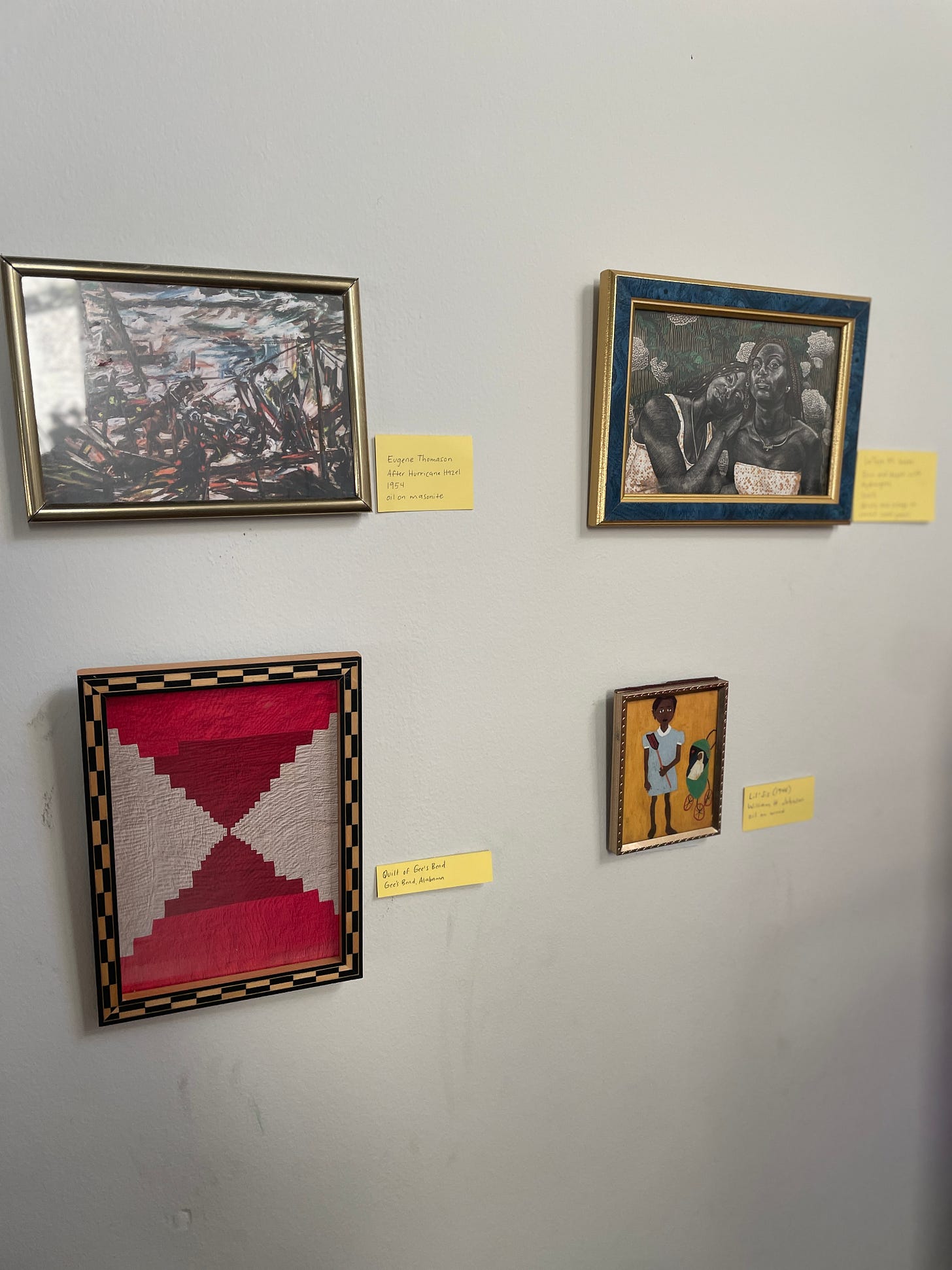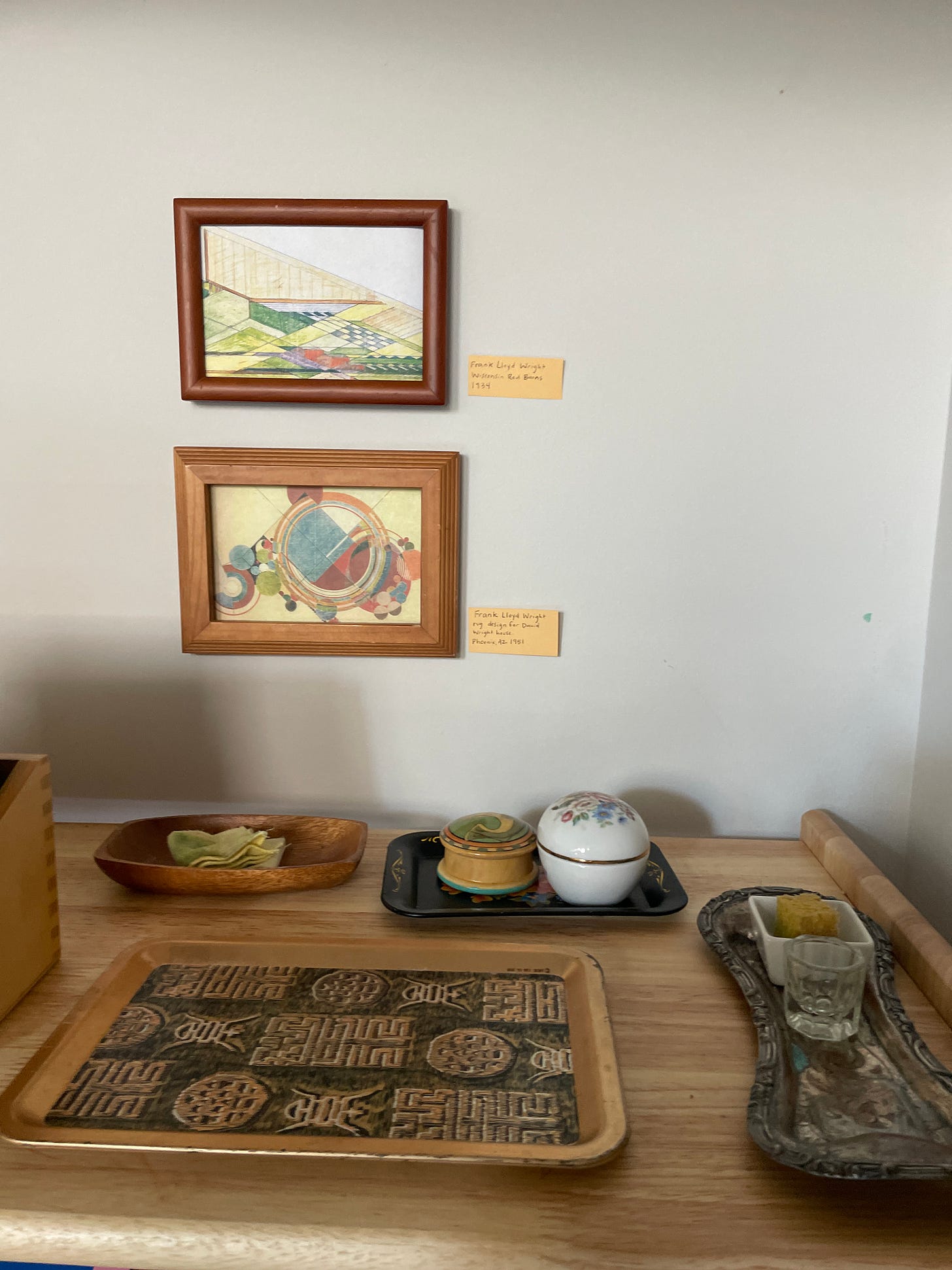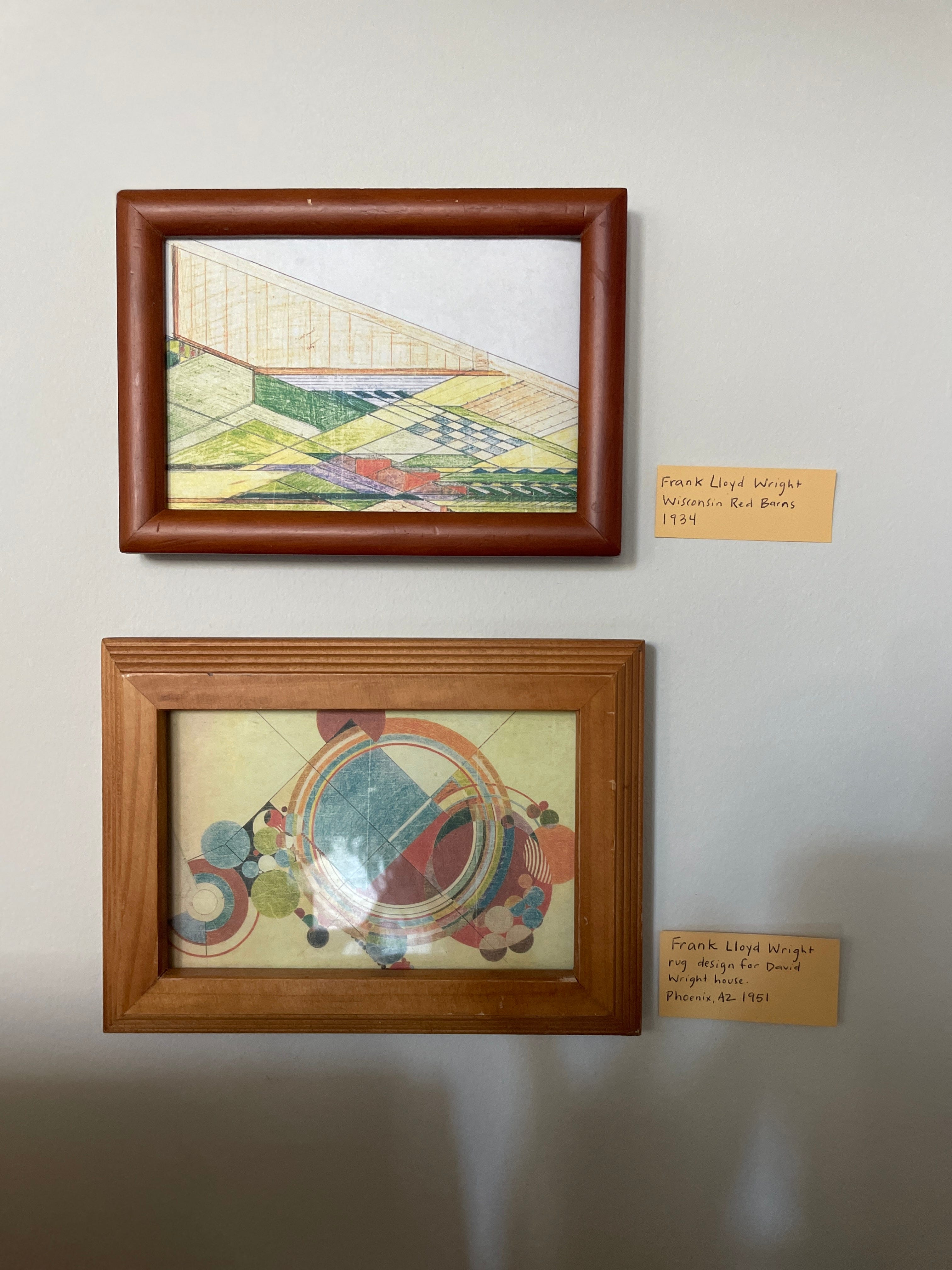 Copies of Frank Lloyd Wright prints hanging above the handwriting shelf with Metal Insets. I thought of Metal Insets immediately when I saw these!