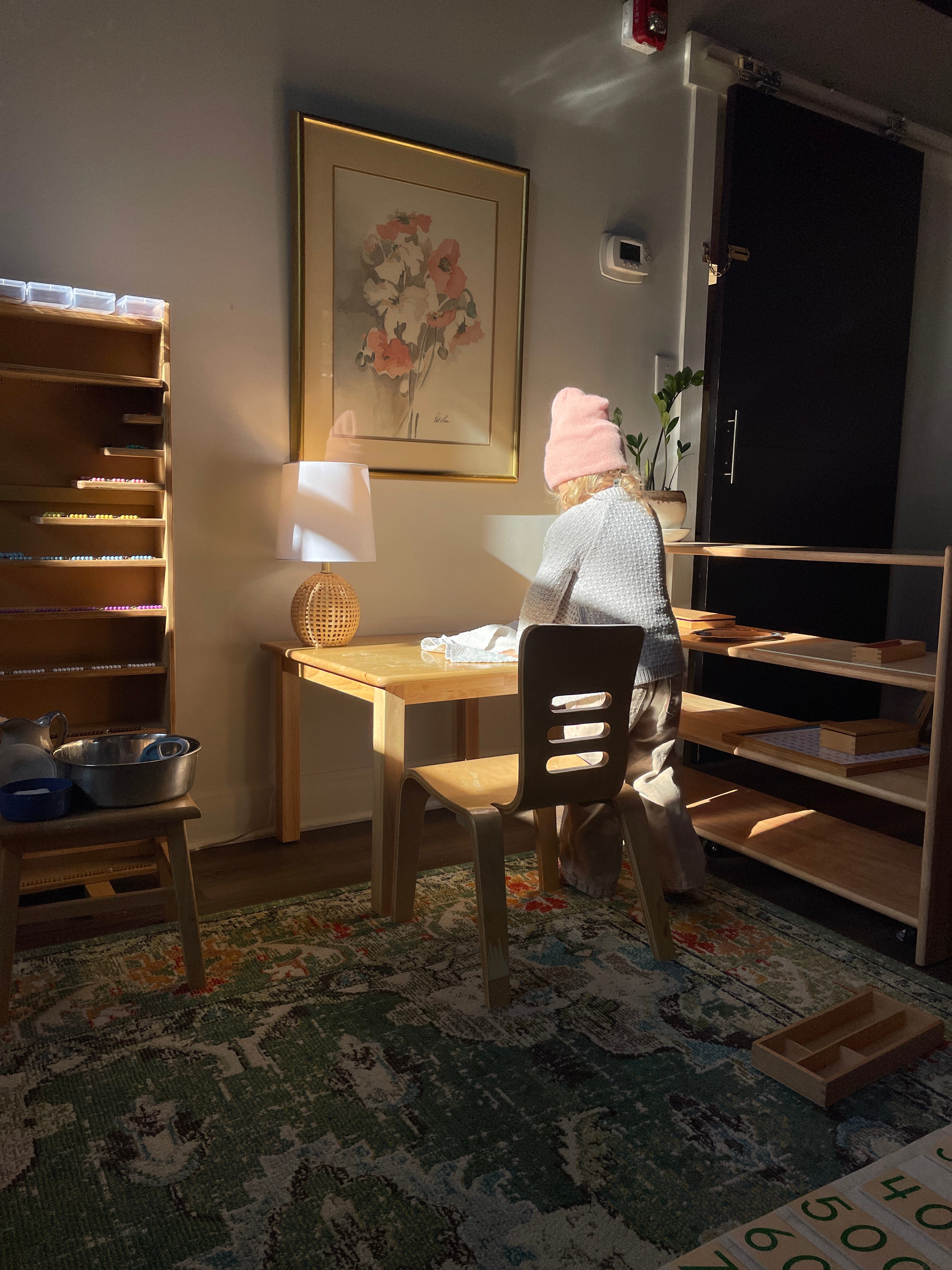 the morning sunlight is so beautiful. This child painted, and then scrubbed the table. I was working with another child on the 45 layout. This part of the classroom has been a work in progress, and it’s so nice to sit in the morning sun and give lessons.
